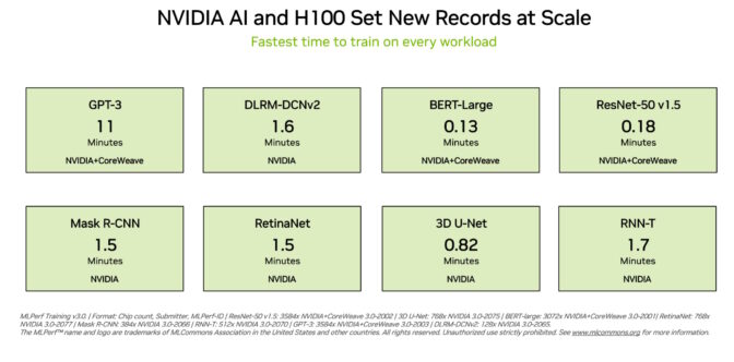 For example, on a commercially available cluster of 3,584 H100 GPUs co-developed by startup Inflection AI and operated by CoreWeave, a cloud service provider specializing in GPU-accelerated workloads, the system completed the massive GPT-3-based training benchmark in less than eleven minutes.