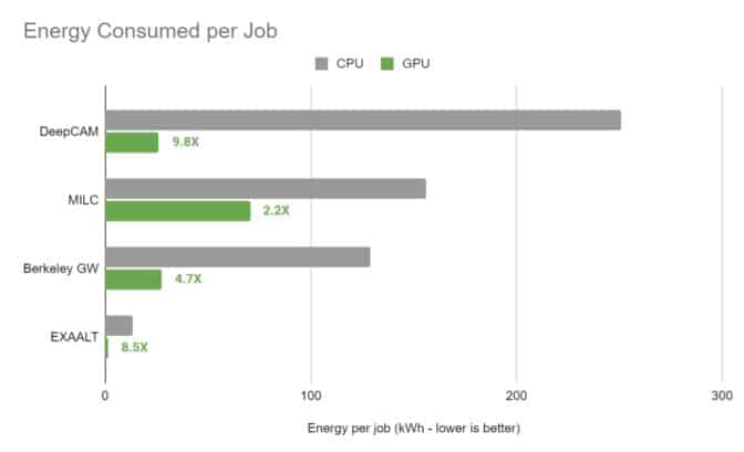 Across four popular scientific applications, the Perlmutter system at the National Energy Research Scientific Computing Center (NERSC) reported energy efficiency gains of 5x on average, thanks to NVIDIA A100 Tensor Core GPUs. An application for weather forecasting logged speed-ups of 9.8x compared to CPUs.