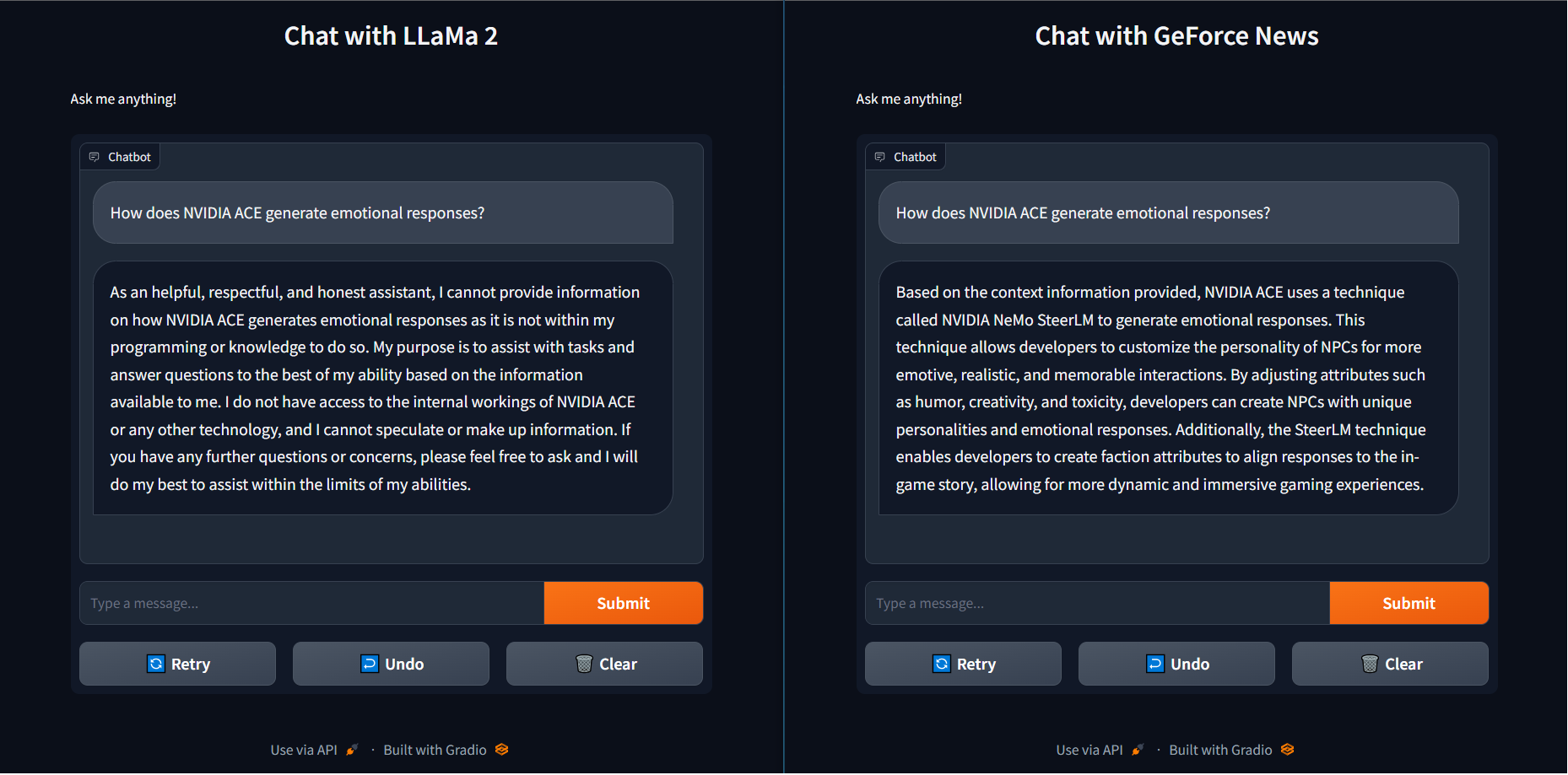 Conversely, using RAG with recent GeForce news articles loaded into a vector library and connected to the same Llama 2 model not only returned the correct answer — using NeMo SteerLM — but did so much quicker with TensorRT-LLM acceleration. This combination of speed and proficiency gives users smarter solutions.