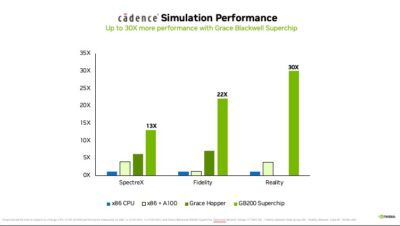 But that’s changing. The Cadence SpectreX simulator is one example of an analog circuit design solver. SpectreX circuit simulations are projected to run 13x quicker on a GB200 Grace Blackwell Superchip — which connects Blackwell GPUs and Grace CPUs — than on a traditional CPU.