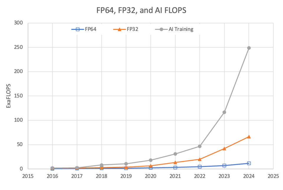 Across the TOP500, the widespread use of AI and mixed-precision floating-point operations reflects a global shift in computing priorities. A total of 249 exaflops of AI performance are now available to TOP500 systems, supercharging innovations and discoveries across industries.