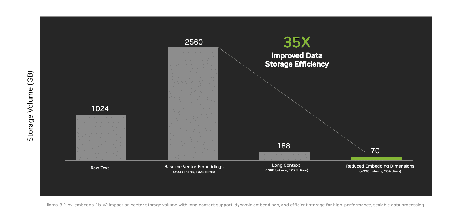 - Deliver actionable intelligence at greater scale with 35x improved data storage efficiency through new techniques such as long context support and dynamic embedding sizing.